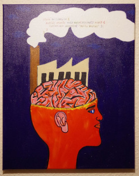 My cousin is a painter. When I told her about my decision to become a programmer and how I feel like that penguin in the water, when I'm coding, she painted this